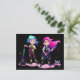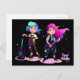 Two girls musicians play rock guitars together. They smile and feel cheerful. Blue is wearing stylish pants in a cage and punk style suspenders with a Mickey Mouse T-shirt. Red is wearing a stylish and bright outfit that emphasizes her personality. The illustration is bright and joyful with a wonderful characters full of harmony and happiness. They make a wonderful musical duo.
