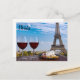 Two glasses of red wine with snacks with view of Paris and Eiffel tower. Glass of red wine with different snacks - plate with ham, sliced, blue cheese. Couple, romantic celebration. Cafe with view.
