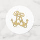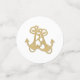 Custom table confetti pieces with gold anchors for a wedding. Paper confetti comes in three sizes with images / text on both sides. Include names of the couple with date of event on the largest pieces. The rest have the gold ship's anchor design only.