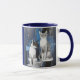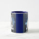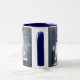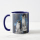 Mug in two cats sitting gracefully against a deep blue, abstract background. The realistic fur textures with bold linework and geometric elements, creates a modern, surreal atmosphere. Their expressive yellow eyes contrast strikingly with the cool-toned surroundings.