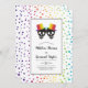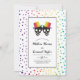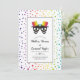 Two skull grooms with hats and confetti in rainbow colours Halloween gay wedding invitation. This wedding design features a rectangular frame with your text and the skulls of two grooms with hats in rainbow colours and colourful confetti around it. A pattern of colourful confetti covers the back.