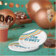 Two Groovy Retro Style Birthday party plates with yellow, orange and blue stripes.
