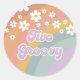 Two Groovy Retro Rainbow birthday stickers with daisies.