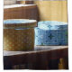 Two decorative round hat boxes with intricate patterns are placed on a wooden shelf by the window. Natural light casts soft shadows, enhancing the vintage aesthetic.