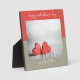 Modern artistic valentine features red / grey colorblock background with centre pic of two red wood hearts and bokeh background, happy valentine's day in white modern script with customisable script at bottom to add your own personal touch.