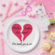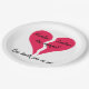 These paper plates are great for an engagement party, dinner, shower or announcement celebration. The design features two halves of a heart that match together. A personalised name is on each heart half and is easy to customise. Below the names are the words "Are engaged!" The customisable words under the hearts say "our hearts join as one". All words can be changed to your own words, added to or deleted or changed to a different event. Easy to customise. The colours are red and black. Fully customisable for a fun engagement party.
