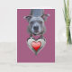 This irresistible Valentine's Day card shows an adorable Pitbull holding two hearts between front paws. The inside message says, "Your heart lives in mine. Will you be my Valentine?"