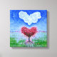 An acrylic painting with 2 hearts, one made of a cloud, another of red leaves, rooted in the ground. Open to your interpretation. Ordinal painting done in acrylic paint.
