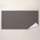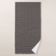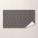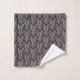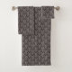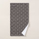 "Two images of dark gray towels with a white floral damask pattern. The first image shows a set hung on a bar; the second is a washcloth with a white corner."