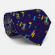 "Two images showing the front and back of a navy blue necktie with colorful abstract patterns. The design appears vibrant against the solid background."