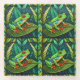 Two intricately designed panels feature vibrant tree frogs with red eyes on lush green leaves, set against a background of stylized tropical foliage.
