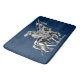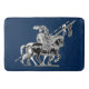 Two knights, one in white and the other in black, are on horseback on this bath rug that has a deep blue background.