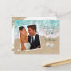 Your special engagement photo, vacation or summertime photo and the playful and fun saying, Two Less Fish in the Sea accents this wedding Save the Date Postcard on a background of turquoise water, beach sand, seashells and starfish. The back of this Save the date Postcard is further decorated with more beach sand, seashells and starfish. If additional coordinating items are needed for your wedding just contact us at prettyfancyinvites@gmail.com with your request.