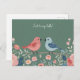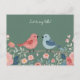 Two adorable little birds, one pink and one blue, perch among pink and cream flowers, on this very cute postcard to say hello to someone.