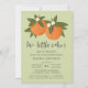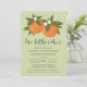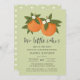 This adorable twin baby shower invitation features a hand drawn / painted oranges design with little blossoms over a custom colour background (shown in light lime green). Stylish typography reads, "Two Little Cuties" are on their way! The back contains a simple, matching orange blossoms pattern. Great for the mama expecting boy / girl twins!