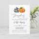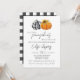 Two little pumpkins are on the way! Celebrate the expectant mum with a fall themed baby shower invite. Two cute pumpkins in black and white buffalo plaid and classic orange add a bit of whimsy and rustic charm to the invitation. A sunflower adorns the orange pumpkin. The back features a black and white buffalo plaid. All details can be customised. This is the perfect gender neutral autumn baby shower invitation for twins.