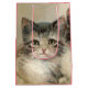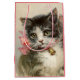 Vintage illustration of two cute little Victorian kittens with pink ribbon and bell.