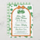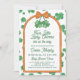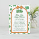 Are you blessed with two little lucky charms and want to throw a four-leaf clover themed baby shower? This gender neutral twin baby shower invitation has a pair of four-leaf clovers tied with an orange bow. The St Patrick's Day baby shower invitation wording is framed by an orange arch. The background features a matching clover pattern, all in a charming hand-drawn style.