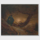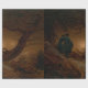 This design features a painting by the 19th-century German artist Caspar David Friedrich (1774–1840). It depicts two human figures in a dark forest. They are silhouetted by a brighter pastel-coloured sky. The sky suggests that the time is around dusk, as the waxing crescent moon appears to be close to setting. The dark foregrounds and light backgrounds create a sharp contrast and produces an effective artistic effect. A dead uprooted tree's dark roots and branches can also be seen in the foreground, contrasting with the sky. The jagged branches and stark contrasts seem to create a threatening environment for the figures, the entire atmosphere is reminiscent of the imposing Gothic style seen originally in the mediaeval era, but revived here in the Romantic period. The figures themselves are dressed in dark colours and stiff somewhat formal garments, which also serve to signify their upper-class status. The artwork suggests spirituality in nature and the presence of the sublime, which are major themes for Caspar David Friedrich. The original German title of the painting is "Zwei Männer in Betrachtung des Mondes", which means "Two Men Contemplating the Moon".