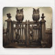 These are intricately carved owl sculptures adorning a rustic wooden gate, creating a captivating entrance. The owls' detailed features and piercing gaze add an element of mystique and charm to the scene