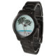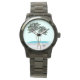 Palm trees at the shore, unisex watch design with customisable watch bands.  Two intertwined palm trees at the edge of the ocean, is the mixed-media image.