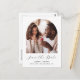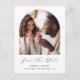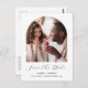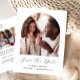 This simple, minimalist boho Save the Date postcard features an arch-shaped photo above the words "Save the Date" in elegant black handwriting script, followed by the couple's names, wedding date and city in sans serif font on a white background. Add a second, rectangular horizontal photo on the back, along with your return address and additional text with more information or details.