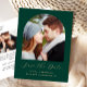 This simple, minimalist boho Save the Date postcard features an arch-shaped photo above the words "Save the Date" in elegant gold-coloured handwriting script, followed by the couple's names, wedding date and city in sans serif font on an emerald green background. Add a second, rectangular horizontal photo on the back, along with your return address and additional text with more information or details.