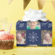 This Christmas gift wrapping paper offers a dark navy blue background with two photo frames that are repeated throughout the design. The background is accented with a white snowflake and custom text for a message and your name.