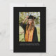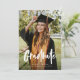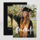 This graduation announcement features a large, full front photo with modern calligraphy overlay and a second photo with additional details on the back. The back elements can be removed by clicking the button to edit further.