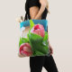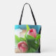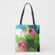 two pink tulips on an all-over printed tote bag