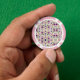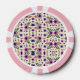 "Two poker chips with pink borders and intricate floral patterns featuring purple and pink flowers on a beige background, shown from front and back."