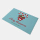 Destei's original illustration of two red and white striped Christmas candy cane treats decorated with a red bow and a Christmas holly / Common holly plant. The background colour is blue. There are also two personalizable text areas.