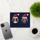 Personalizable Christmas photo template design for two photographs. There is a red Santa hat illustration by Destei placed above each round photo. The Santa hat has a green Christmas Holly plant on it and the background colour is blue. Under the image there are two personalizable text areas that are placed in the foil design area.