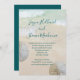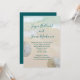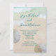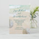 Beach wedding invitations with sand dollars design. Beach sand and tropical blue-green water is the background for text. Full names of the couple, in modern handwritten script at the top of paper with a paragraph of printed text beneath. Enough text space is provided for a reception address and / or wedding website / other information. The wording is perfect for a small, casual gathering. Natural white sand dollars decorate the edges.