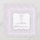 Christian Cross with intertwined wedding rings on white inset against elegant purple damask swirl background, Sophisticated square bridal invitation with Bible verse excerpt from the Gospel of Mark, 10:7,8: "For this reason a man shall leave his father and mother, and be joined to his wife, and the two will become one flesh. So they are no longer two, but one." Celebrate your marriage while sharing your love for Christ with this personalised customisable invite from The Christian Faith Gift Shop.