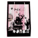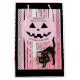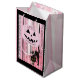 Package your baby shower gifts and favours in style with this adorable two-sided gift bag. The front features a customisable pink pumpkin design against a trendy pink and black striped background, while the back showcases a charming haunted house scene with whimsical ghosts. It's a perfect way to add a finishing touch to your spooky-sweet "Peek a Boo" baby shower.