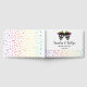 Two skull brides and confetti in rainbow colours Halloween lesbian wedding guest book. This wedding design features the skulls of two brides with bows in rainbow colours and colourful confetti. The back includes a pattern of colourful confetti.