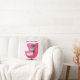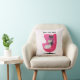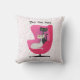 This throw pillow has two sophisticated cats, one black and one white in a mid century style sitting in a bright pink chair wearing diamond collars on a white background with pink dots. Customise your text with the template on the front and back.