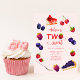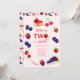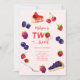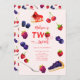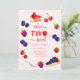 Fun cakes and berry themed 2nd birthday party invitation featuring illustration of cheesecake, tarts, and berries. The text says "XX is two sweet."