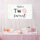 Cute and fun donut theme birthday party decor featuring an illustration of a pink and white glazed donut with colorful sprinkles around. The text in the middle says "TWO SWEET." Customize this product by adding your child's name and event date. Designed for a girl's 2nd birthday celebration.