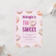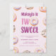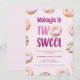 This birthday party invitation features doughnuts and "two sweet" to invite friends and family to celebrate your little one turning 2.