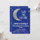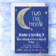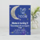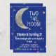 Birthday party invitation with a Two The Moon theme for second birthday parties. The grey crescent moon is on a dark blue night sky background with silver and gold stars. Editable with your name and address information, use the personalizationin the listing to customise it.