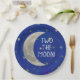 Party plates with a Two The Moon theme for second birthday parties. The grey crescent moon is on a dark blue night sky background with silver and gold stars.