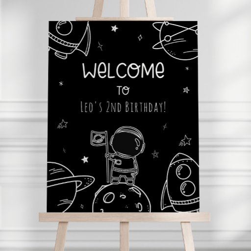 Invite friends and family to your child's second birthday party with this adorable outer space birthday invitation in a modern minimal black and white design.