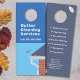 Two tones blue colours door hanger with an illustration of a roof and gutter of a house and some fall leaves. It could be used for small business such as roof and gutter cleaning or repair, moss removal, handyman, pressure washing service, etc.