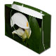 Glamorise your gifting with this large style gift bag that features a photo image of two, gorgeous, white Calla Lilies along with their green foliage. Bag trim colour is green. A lovely, floral design! Select your gift bag style.