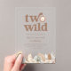 This birthday invitation features a sweet watercolor lion face with the phrase "two wild," accented by neutral toned jungle leaves along the bottom. Perfect for a safari-themed second birthday celebration!
