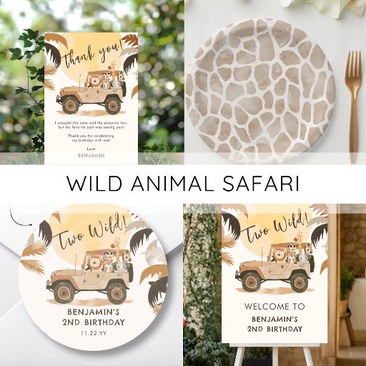 Looking for the perfect invitation to celebrate your little one's second birthday? Look no further than our adorable safari-themed invitation, featuring a safari truck filled with all kinds of safari animals, including a lion driving the truck, a leopard, a meercat, a giraffe, an elephant, and a zebra. The invitation also features a huge sun in the background and tropical leaves in earthy safari tones of neutral beige and browns, making it the perfect way to set the tone for your little one's wild birthday celebration.
