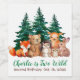 There is a group of cute forest animals painted in watercolor: a red fox, a brown bear, a hedgehog, a deer, an owl and a rabbit., with green pine trees behind them. Under them, the message "Charlie is Two Wild" is written in a handwriting script, and the occasion and date under it , in small grey caps.