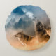 Two wolves howl at the full moon in forest round cushion